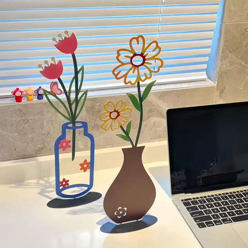 Minimalist 2D Metal Flower Vase Ornament – Desktop & Shelf Decor